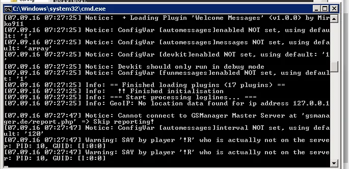 So aber wenn ich ihn starte kommt zwar was started aber unter status not running und im Game mit !admintest kommt auch nichts !!