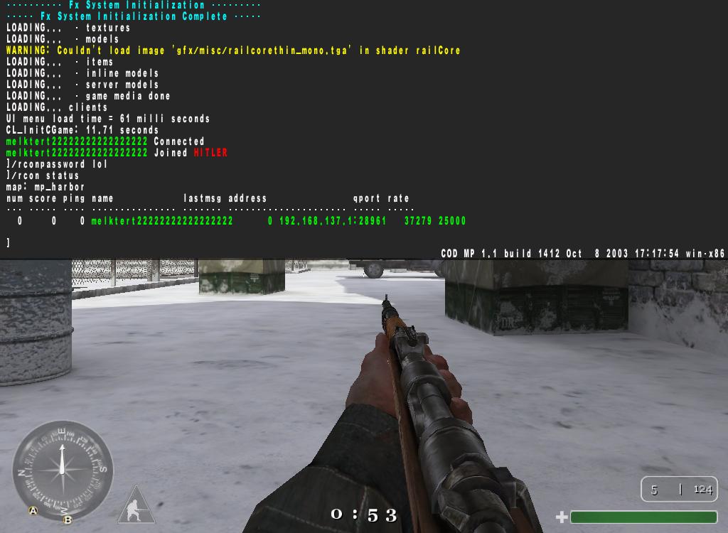 2:44 InitGame: \g_gametype\sd\gamename\Call of Duty\Location\Germany\mapname\mp_harbor\Owner\Evil Born Modders\protocol\1\shortversion\1.1\sv_allowAnonymous\0\sv_floodProtect\1\sv_hostname\^0[^700^0]^7EBM ^0iSnipe ^7BETA\sv_maxclients\24\sv_maxPing\0\sv_maxRate\25000\sv_minPing\0\sv_privateClients\2\sv_pure\0
